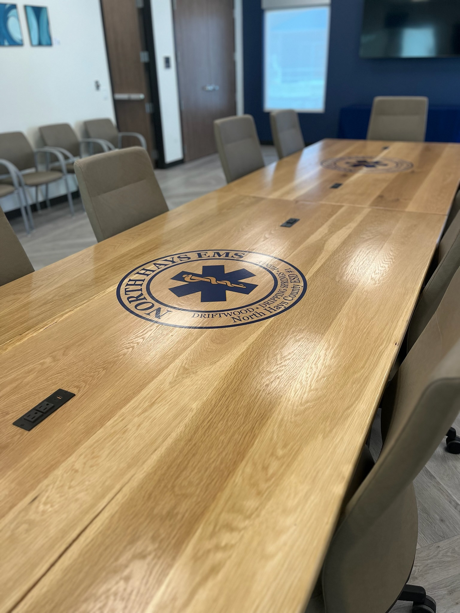 We had the privilege of working with the North Hays EMS team to craft four custom white oak conference tables for their new facility. Each table featured a transparent decal of their logo, adding a meaningful touch that reflects their pride and dedication to the community.
