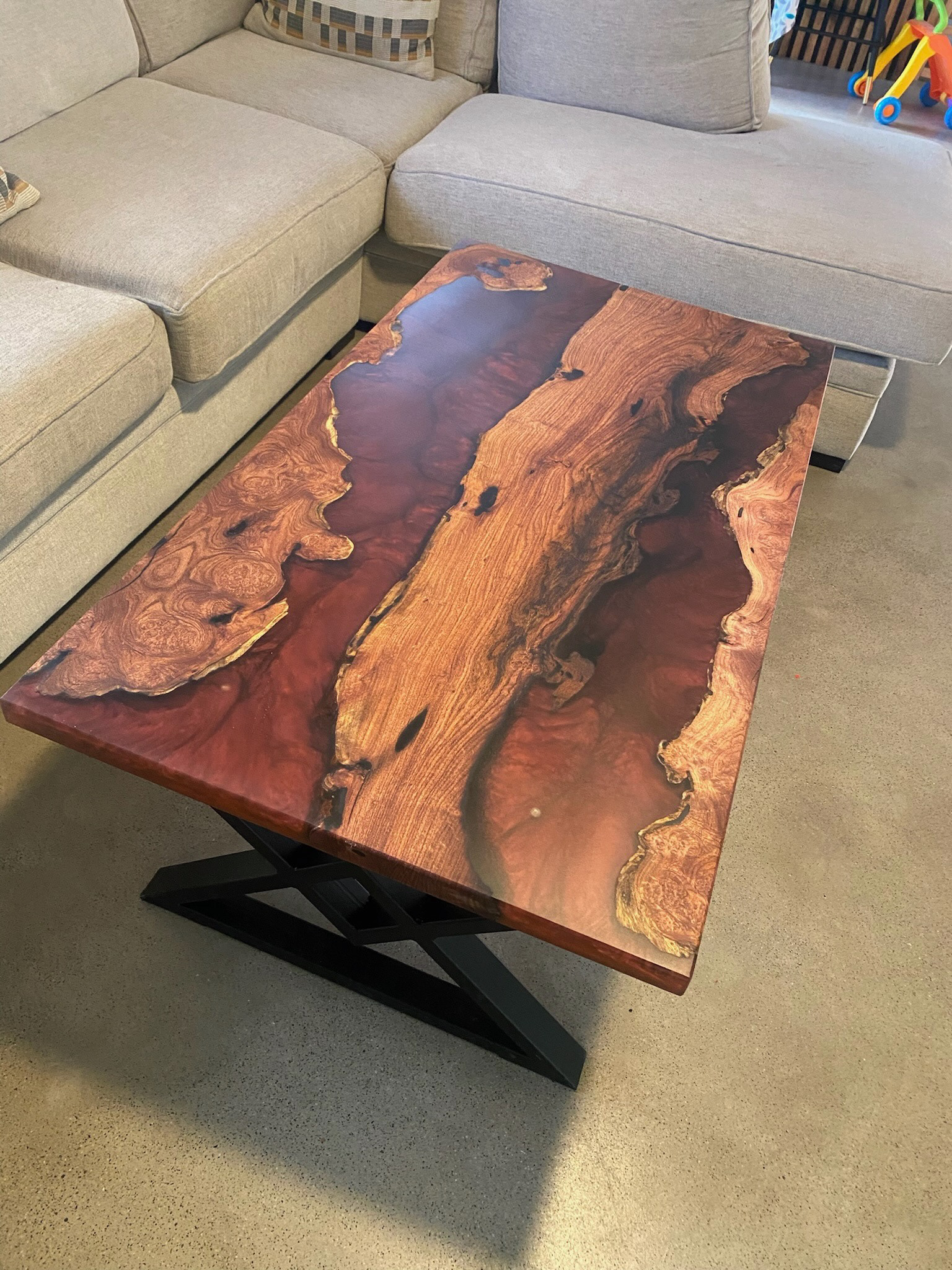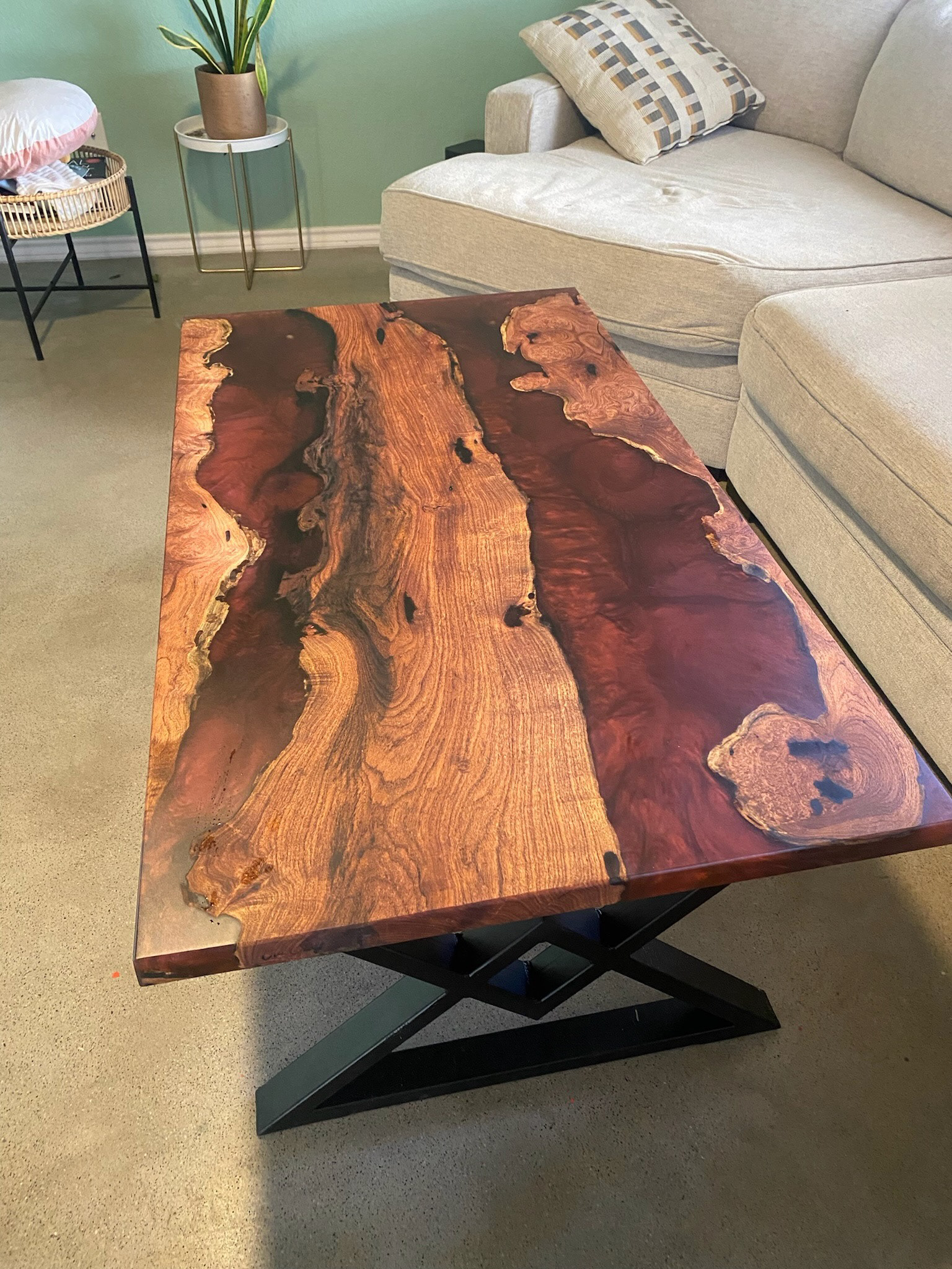 This custom river table features rich mesquite wood and a deep maroon epoxy pour. I also had the chance to weld a set of diamond-shaped metal legs to give it a clean, modern finish.
